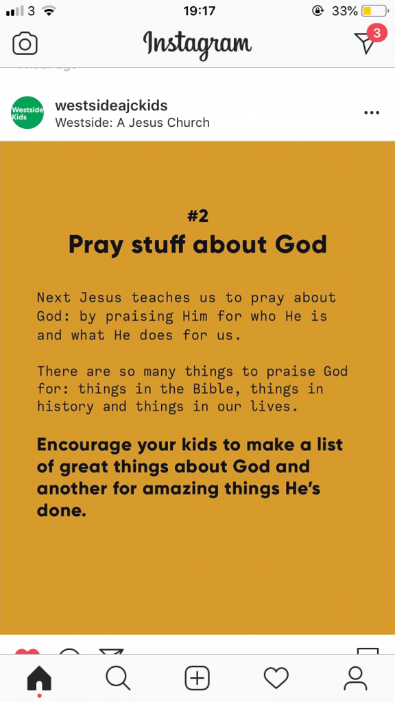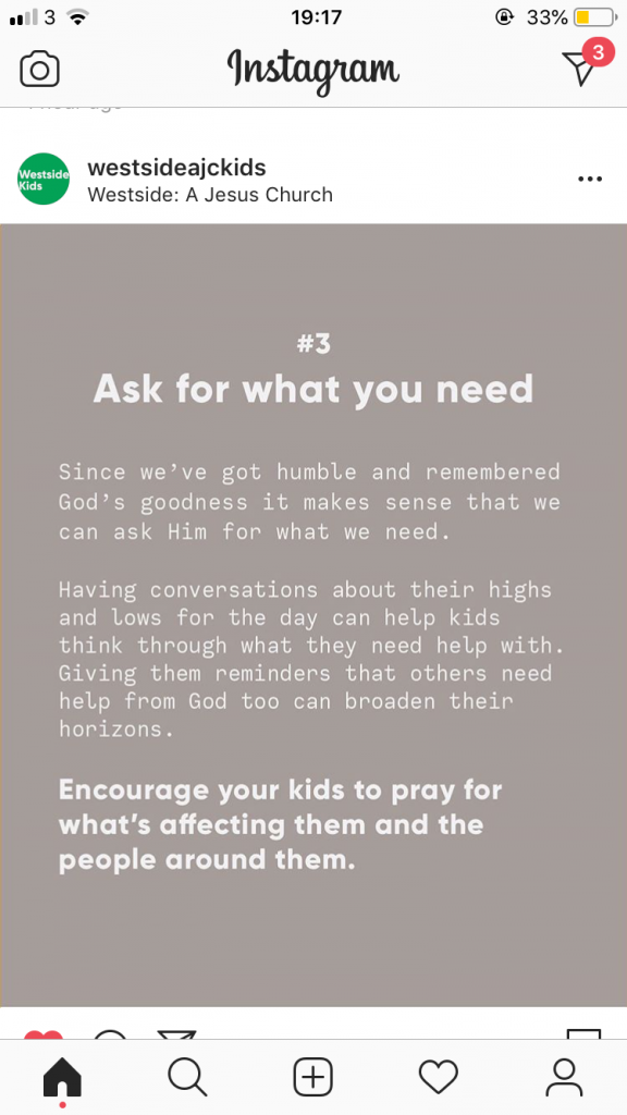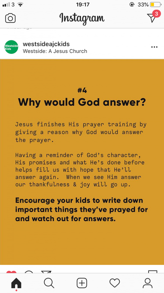 I mentioned in one of the videos about praying, and being specific when you pray and how prayer is a skill that we have to learn. Here are 4 tips that will help you kids build your prayer life. Special thanks to Crooksy, the Kid’s Pastor at Westside: A Jesus Church in Portland, Oregon for these brilliant resources. (It’s their Instagram handle, weatsideajckids, that’s at the top of the slides!)